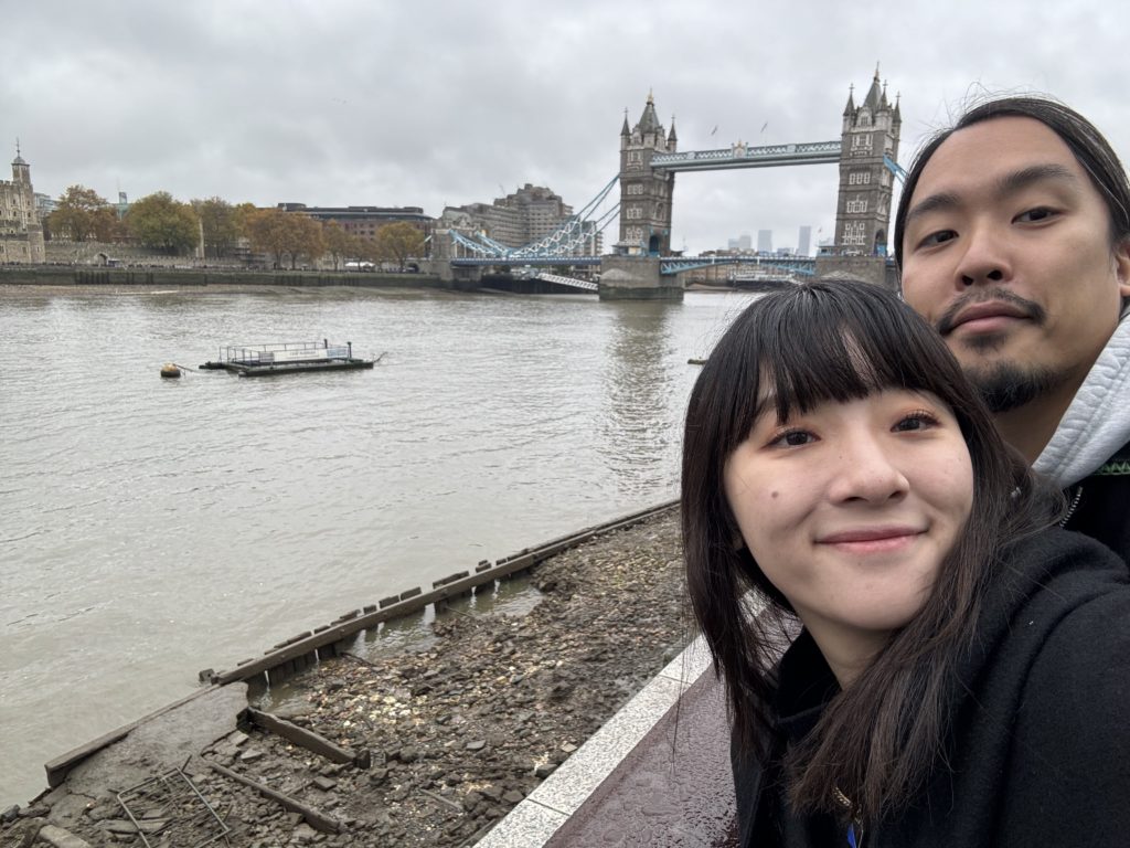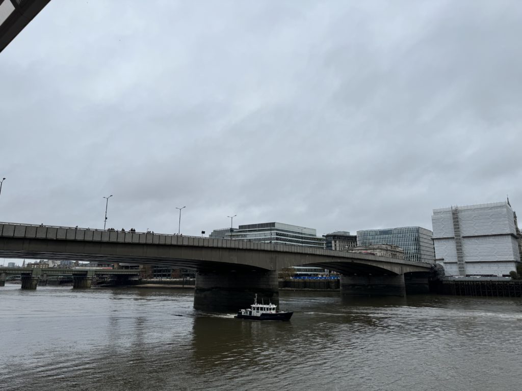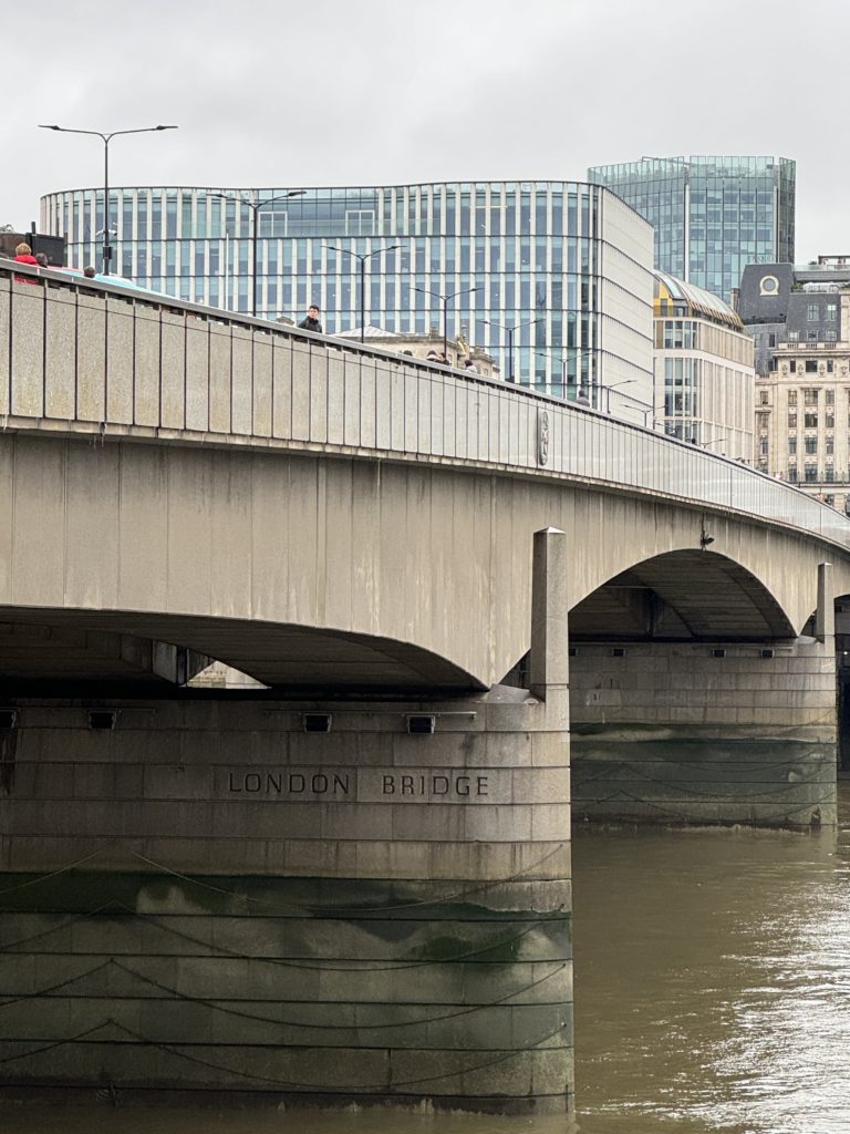 からの、タワーブリッジの麓にあるりゅうおすすめのリゾットが美味しいレストランに行く予定が、違う店になっとったー!みたい。最後に来たの5.6年前らしいから、そりゃコロナもあったし変わるよなぁとか話しながらテクテクしてたらロンドンブリッジ発見。