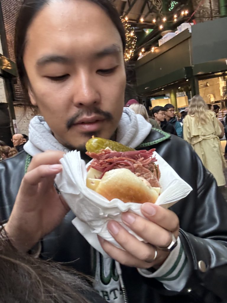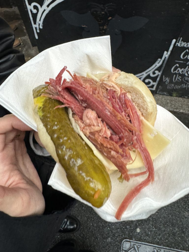 まずはりゅう。なんかめっちゃ美味しそうなベーグル!お肉もりもり!ピクルスまんま乗ってる(笑)ボリューミーーーーこれで12ポンド!円に換算すると悲しくなるのでやめておきます!(1ポンド=186円なう……..)