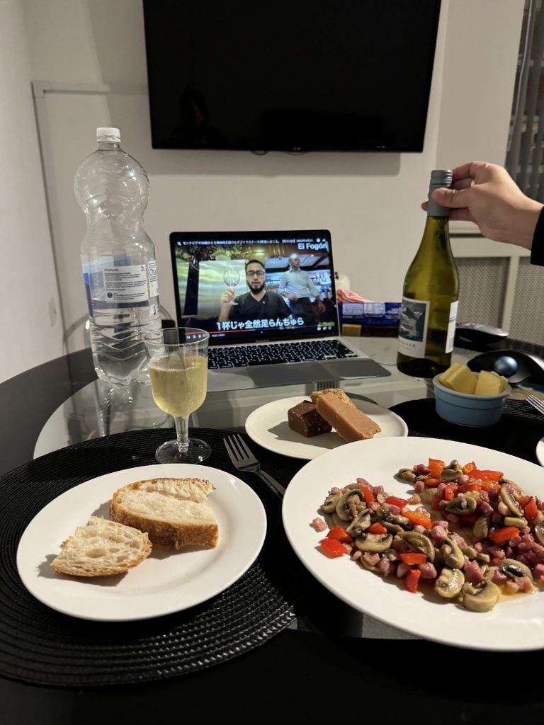帰宅後、残り物の食材でおつまみつくってワイン呑みながら、シゲ旅みて、