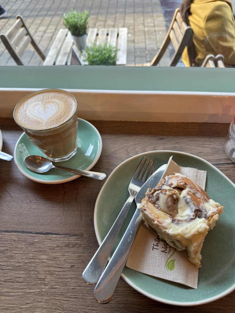 私たちは店内の窓際へ着席。コーヒーだけ飲むつもりが、シナモンロールまで頼んでいますね……