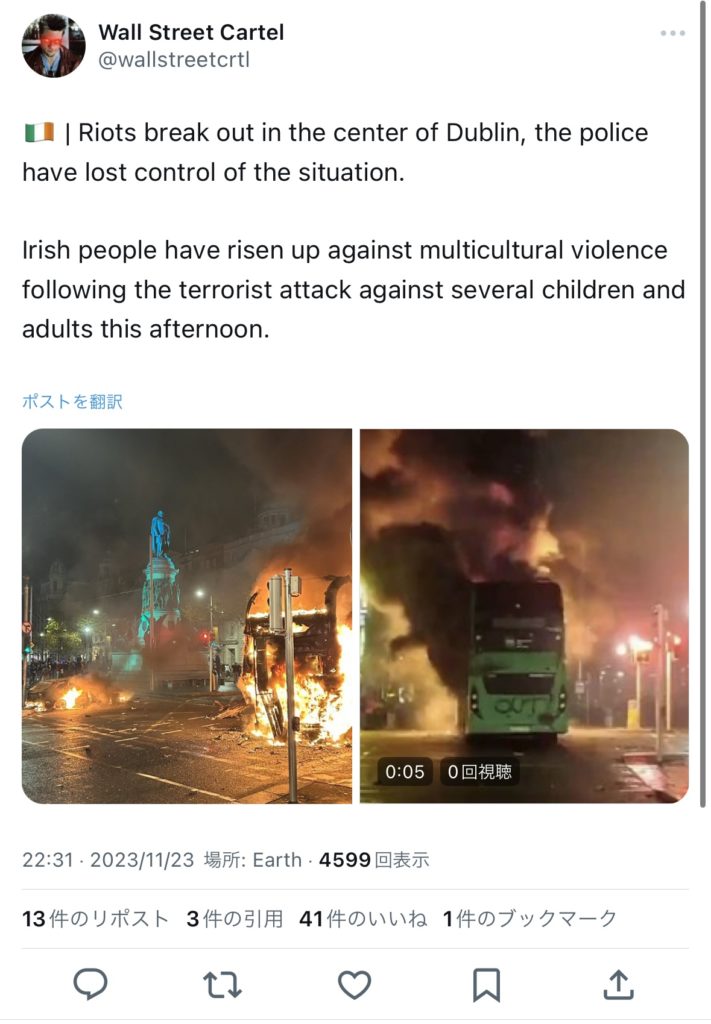 ↑の暴動の経緯としては、移民の男性が通り魔事件を起こしたことに、反移民派の人たちが政府に対する抗議デモを起こしたのが暴徒化しちゃったみたいです。なかなか派手にやってて怖すぎる。